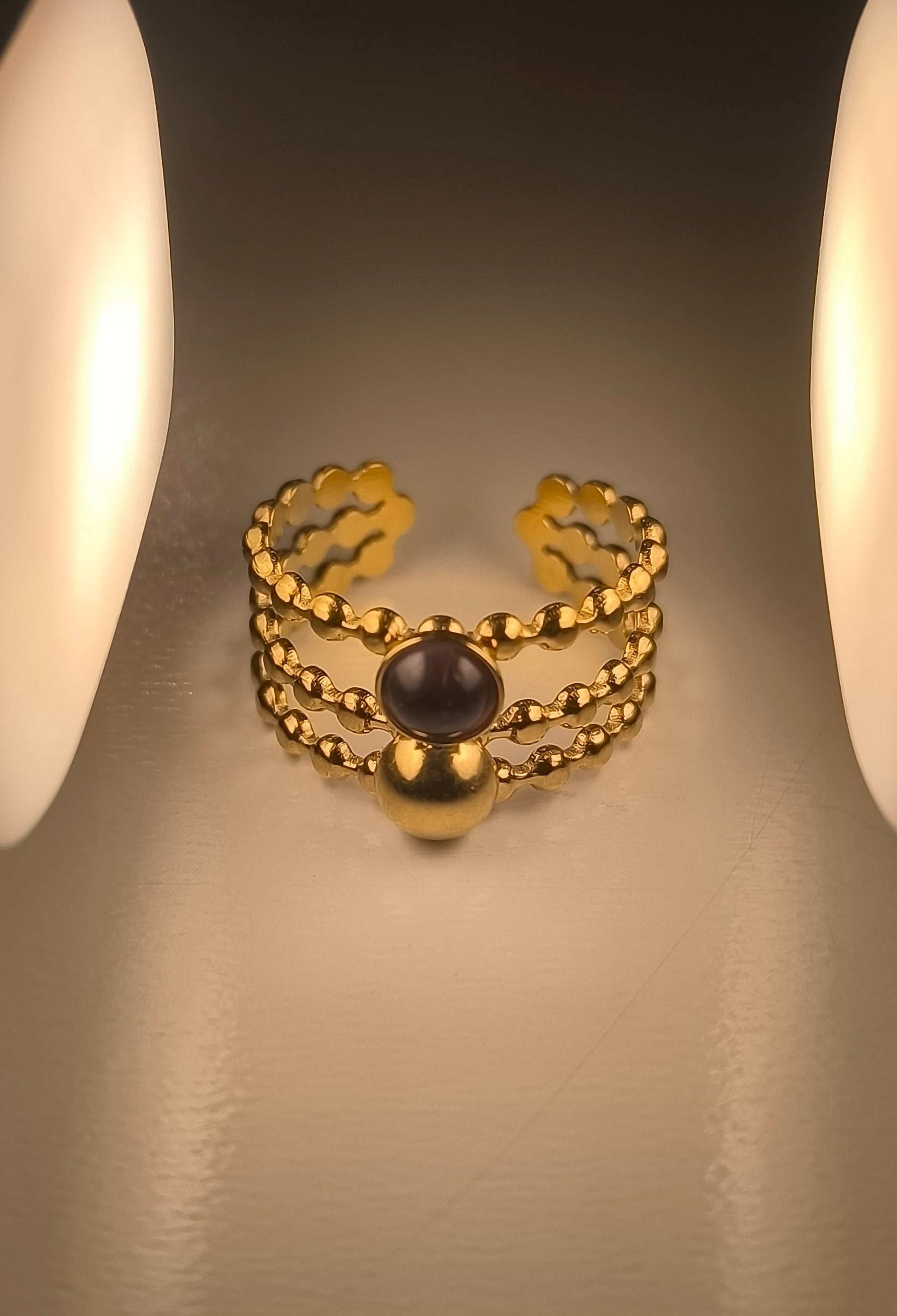 Bague Ajustable "Aura Nocturne" en Acier Inoxydable Or & Améthyste Noire • Adjustable "Nocturnal Aura" Ring - Stainless Steel & Black Amethyst