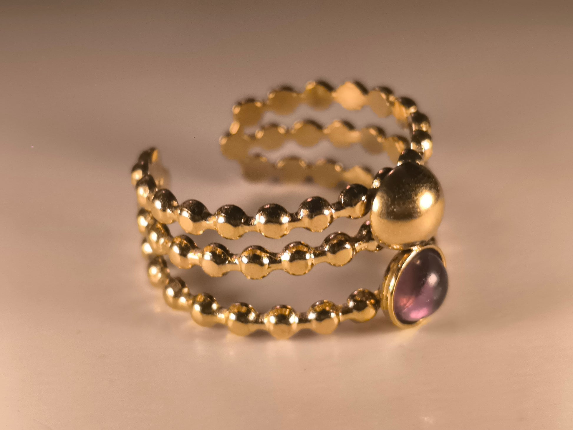 Cette bague ajustable est une pièce sophistiquée qui attire l'œil avec son contraste saisissant entre l'or et le violet profond.